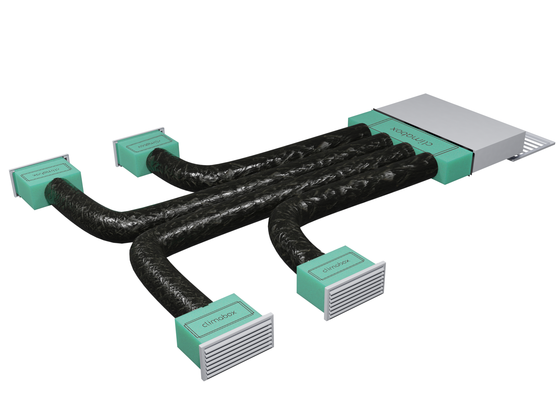 Kit completo per un canalizzato a 4 vie composto da: 1 Plenum macchina isolato con 4 attacchi flessibile 4 Climabox per le tue stanze 4